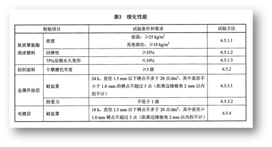 標準在第5章要求中,詳細規定了辦公椅的主要尺寸、形狀和位置公差、和外觀要求。并且規定了產品中軟質聚氨酯泡沫塑料、紡織面料、金屬件涂層、電鍍層的理化性能,給出了需要檢驗的項目、實驗條件、要求和試驗方法。