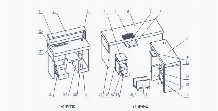 木制寫字桌產品按結構形式可分為單體式寫字桌和組合式寫字桌;按桌面是否可升降可分為升降桌和非升降桌。不同類型的寫字桌在零部件構造上存在差異。