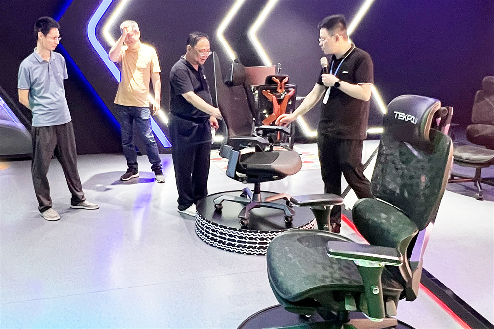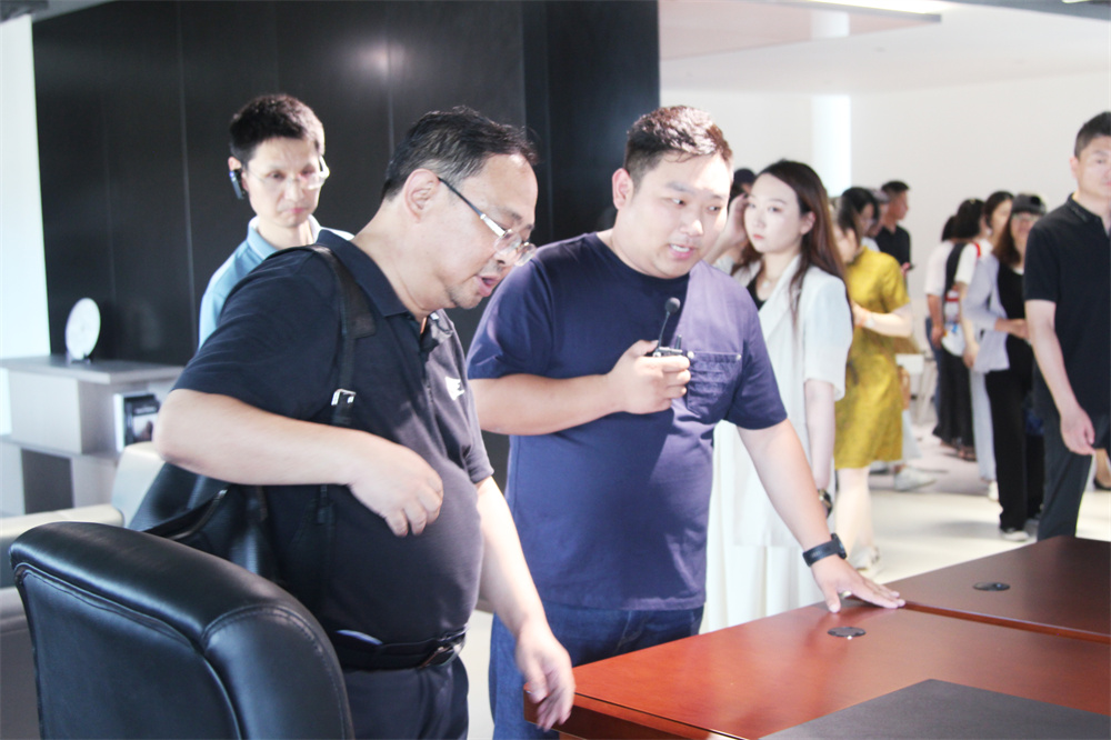 接著,考察團一行來到永藝家具股份有限公司,國內渠道營銷中心總監張棟梁熱情接待并對展廳產品進行講解。考察團成員們對展廳中的產品都進行了認真的試坐親身體驗了這些家具產品的舒適度與實用性。同時,他們還結合自身的專業知識與行業經驗,助力企業進一步優化產品設計,提升市場競爭力。