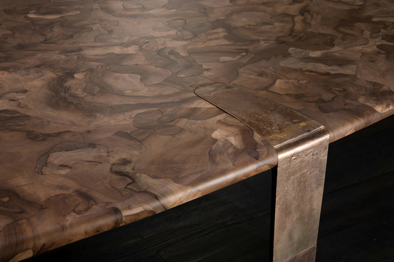有機形狀的餐桌由四個直接融入木質表面的青銅色沙腿支撐。
