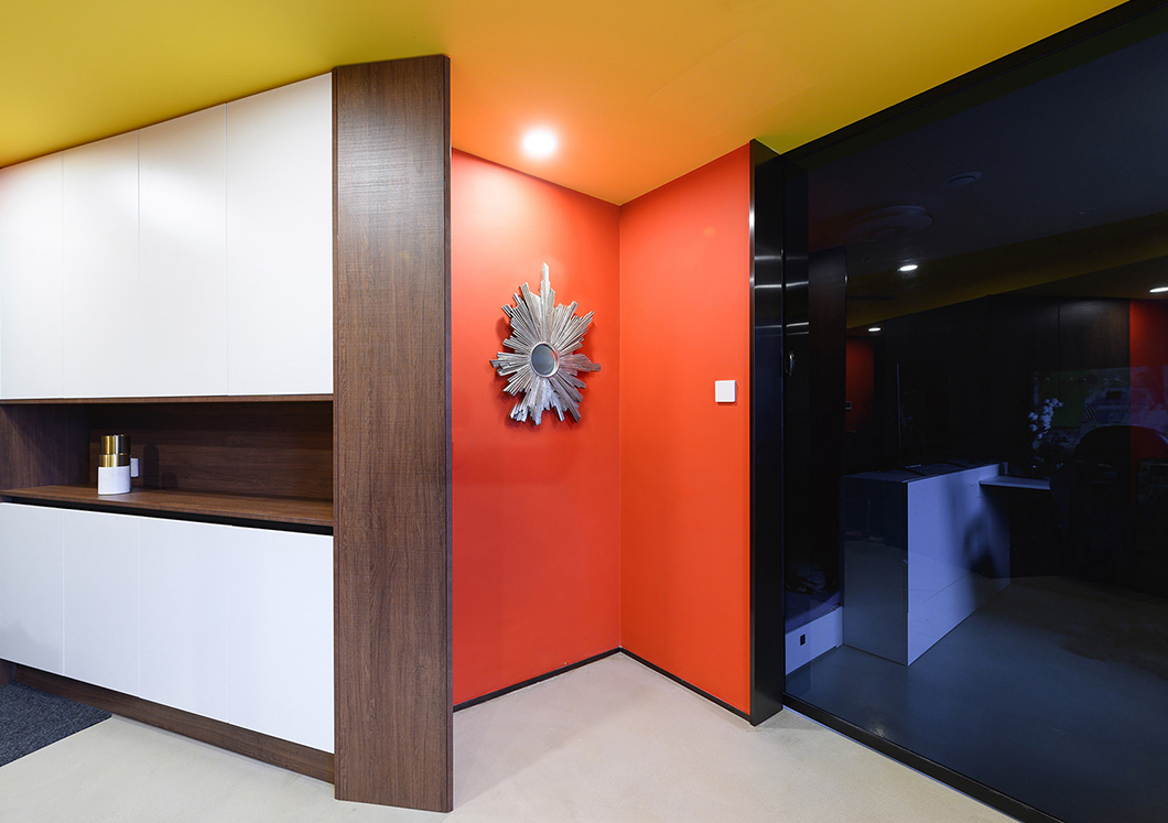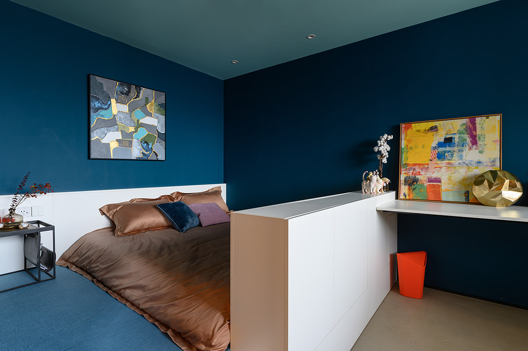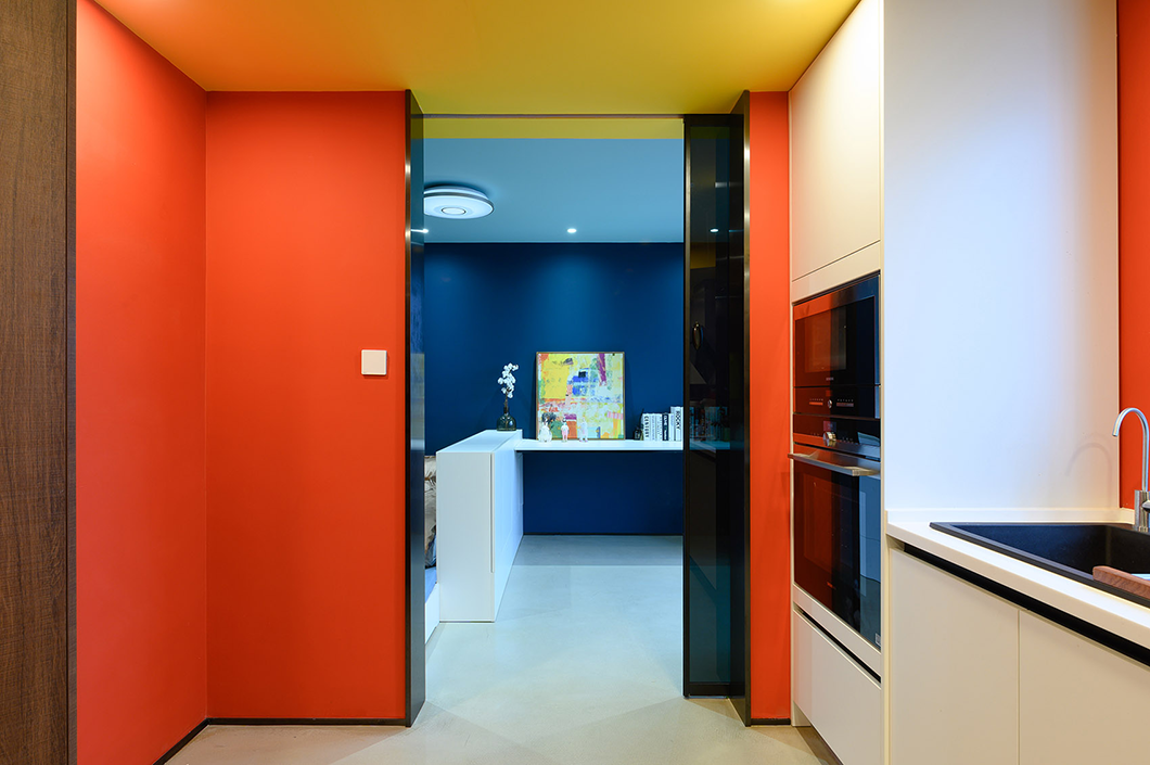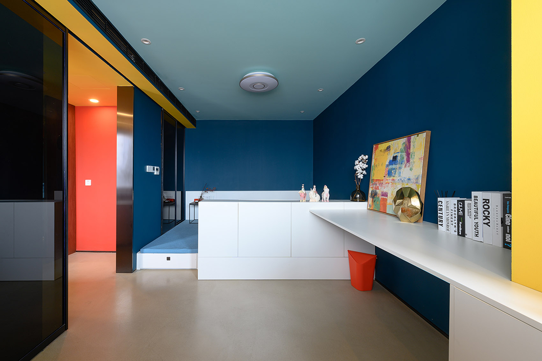 房間采用跳躍的色彩搭配,營造出年輕活力的氛圍。暗色搭配條狀明黃色讓狹小的空間秩序感更強(qiáng)。