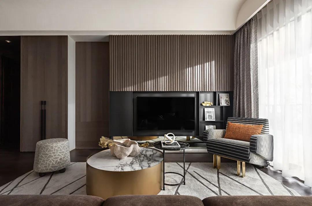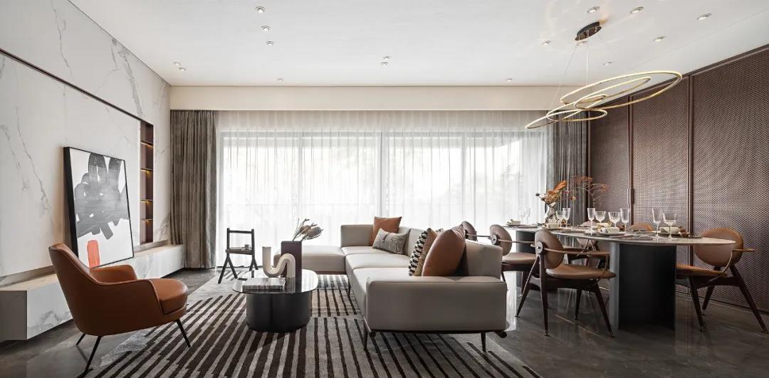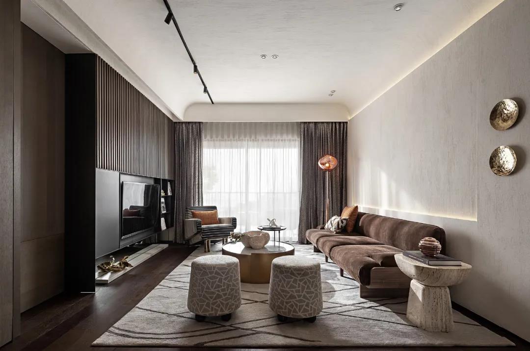 本案設計將“秋色”作為情境營造主題,選用暖咖色皮革作為勾勒空間的靈魂元素,再加以原木、金屬、布藝、天然石材等質感相異的材料進行有序的配搭,使空間色調主次分明,冷暖諧和。極具設計感的燈具、雕塑、掛畫看似隨意的添置,為空間增添不凡的藝術氣息,整體空間理性中不乏精致。