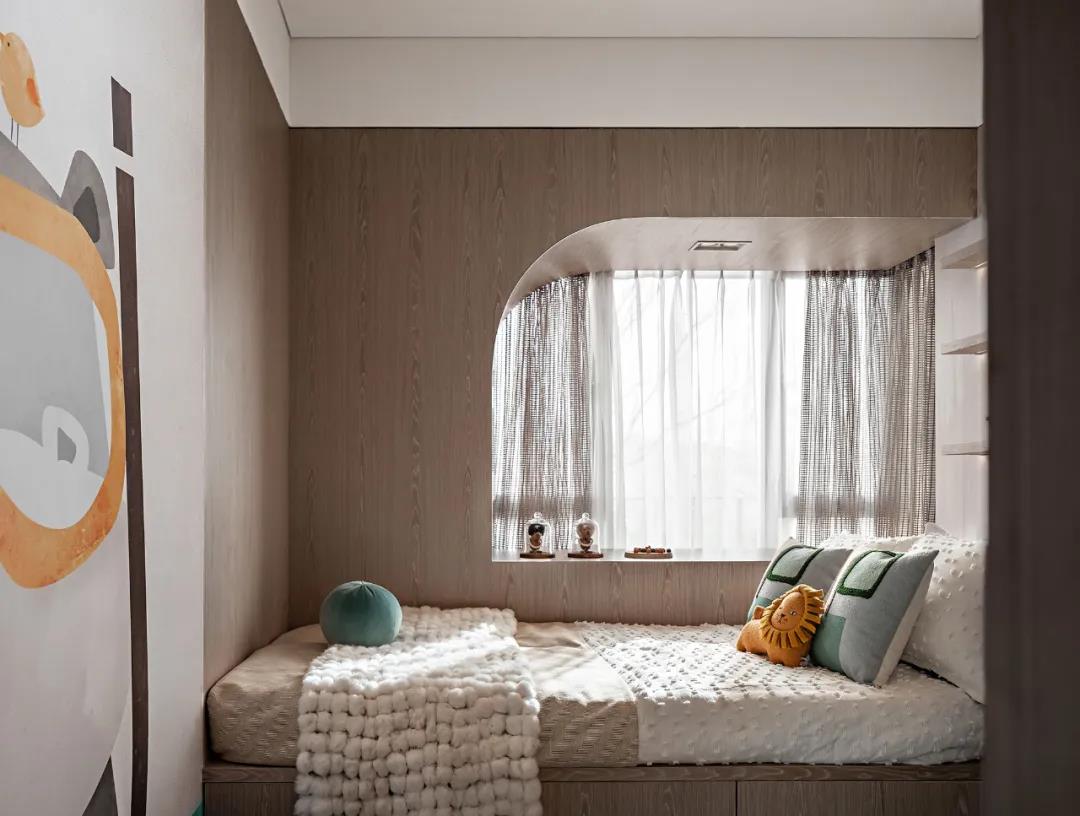 兒童房的設計,除了以童趣夢幻的色彩營造居住氛圍外,還在多個細節處體現人性化考量。為保障孩童的健康與安全,設計特別選用溫潤細膩的天然木質與柔軟舒適的布藝作為主材料,而弧形的飄窗頂部設計,也貼心地為孩子好動爬高的天性打造一把“保護傘”。