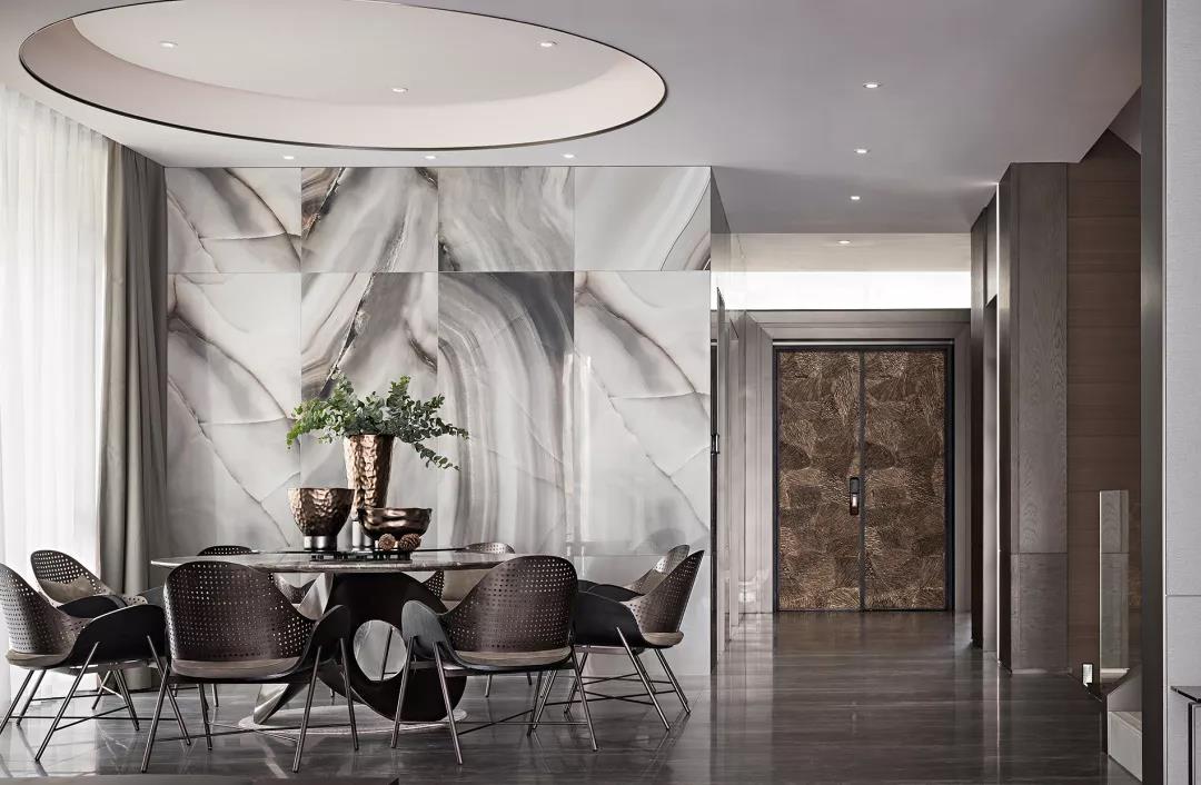 餐廳與客廳開敞聯(lián)合,有效拓展了公共區(qū)域的活動范圍與分區(qū)層次,超大化挖掘相鄰場域的滲透與交互,大理石背景亦成為空間共同語匯,回應了現(xiàn)代人返樸歸真的訴求。以個性銅材餐桌與擺設營造氣息輕爽的用餐環(huán)境,邊用餐,邊感受藝術之美,感悟生活之味。