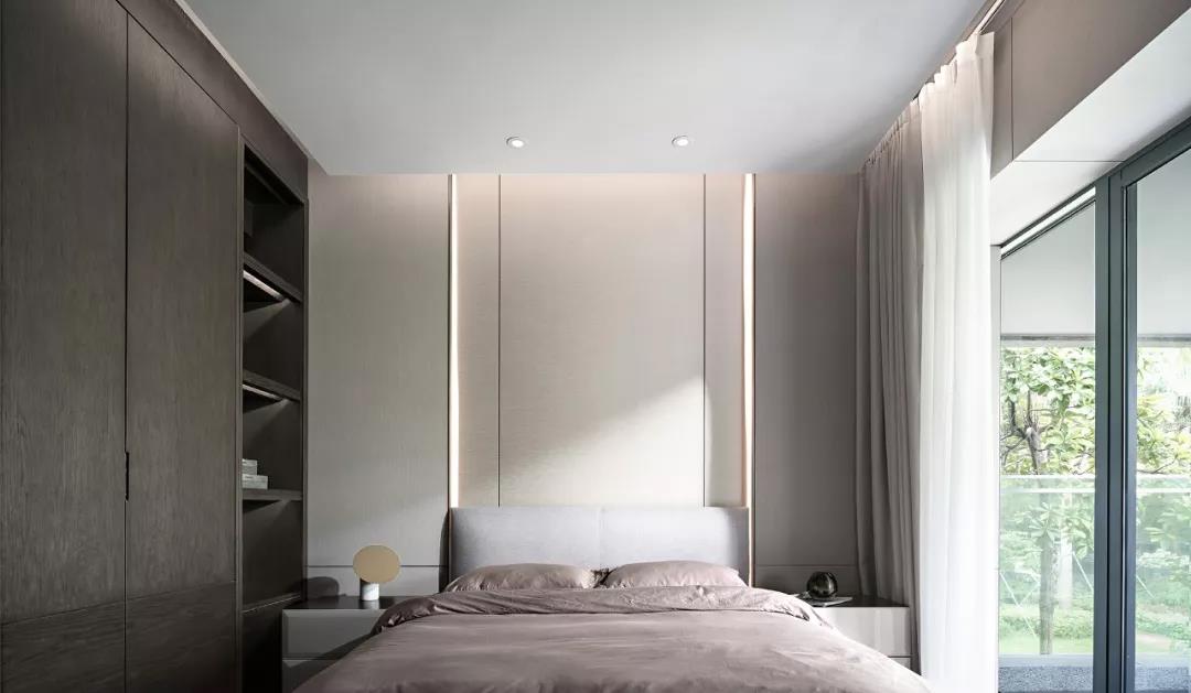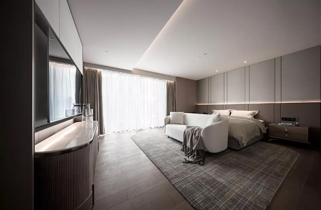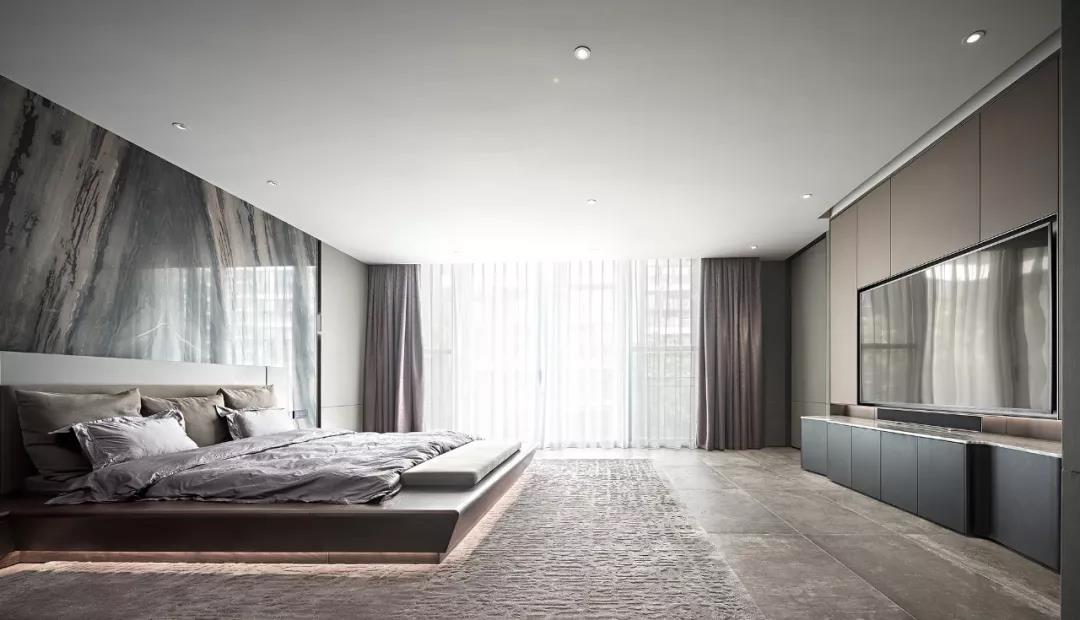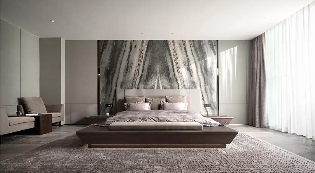 進入主臥,大理石背景墻和客廳餐廳背景墻設計如出一轍,作以造型延伸。莫蘭迪色與諸多質(zhì)感層次的碰撞與交融,增加一種高級和舒適的氛圍感,設計師將對家的理解溫暖地投注進去。
