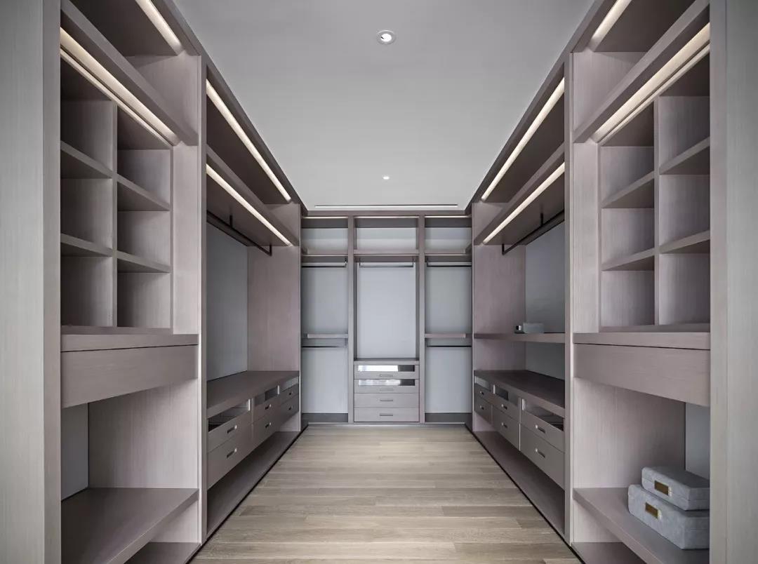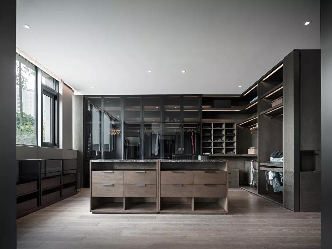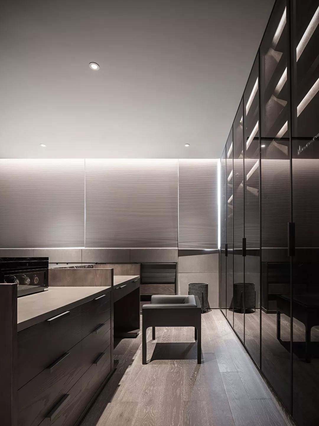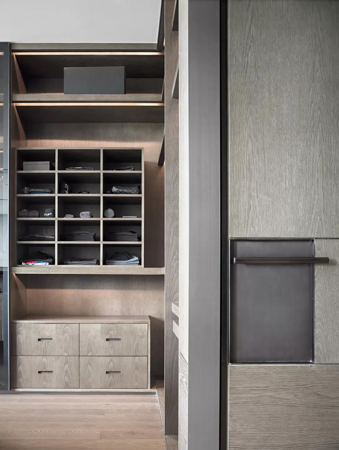 衣帽間環(huán)視所見,硬朗與柔軟、溫潤與質(zhì)感、點與線、大與小......交融共舞。這皆是設計師精準拿捏室內(nèi)尺寸、收納比例、構(gòu)圖審美及細節(jié)重視的絕佳證明。