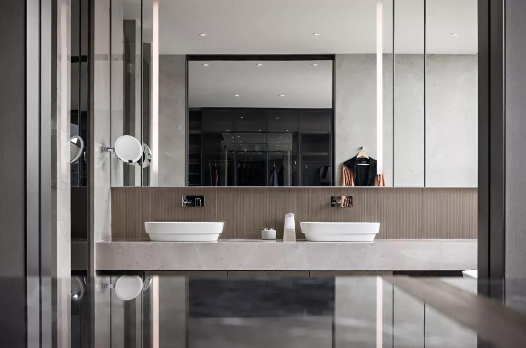 臥室和衛(wèi)生間通過條紋地毯與大理石紋理進行象征性的貫穿,產(chǎn)生流動感,高級氣質(zhì)中更加彰顯輕松寫意。