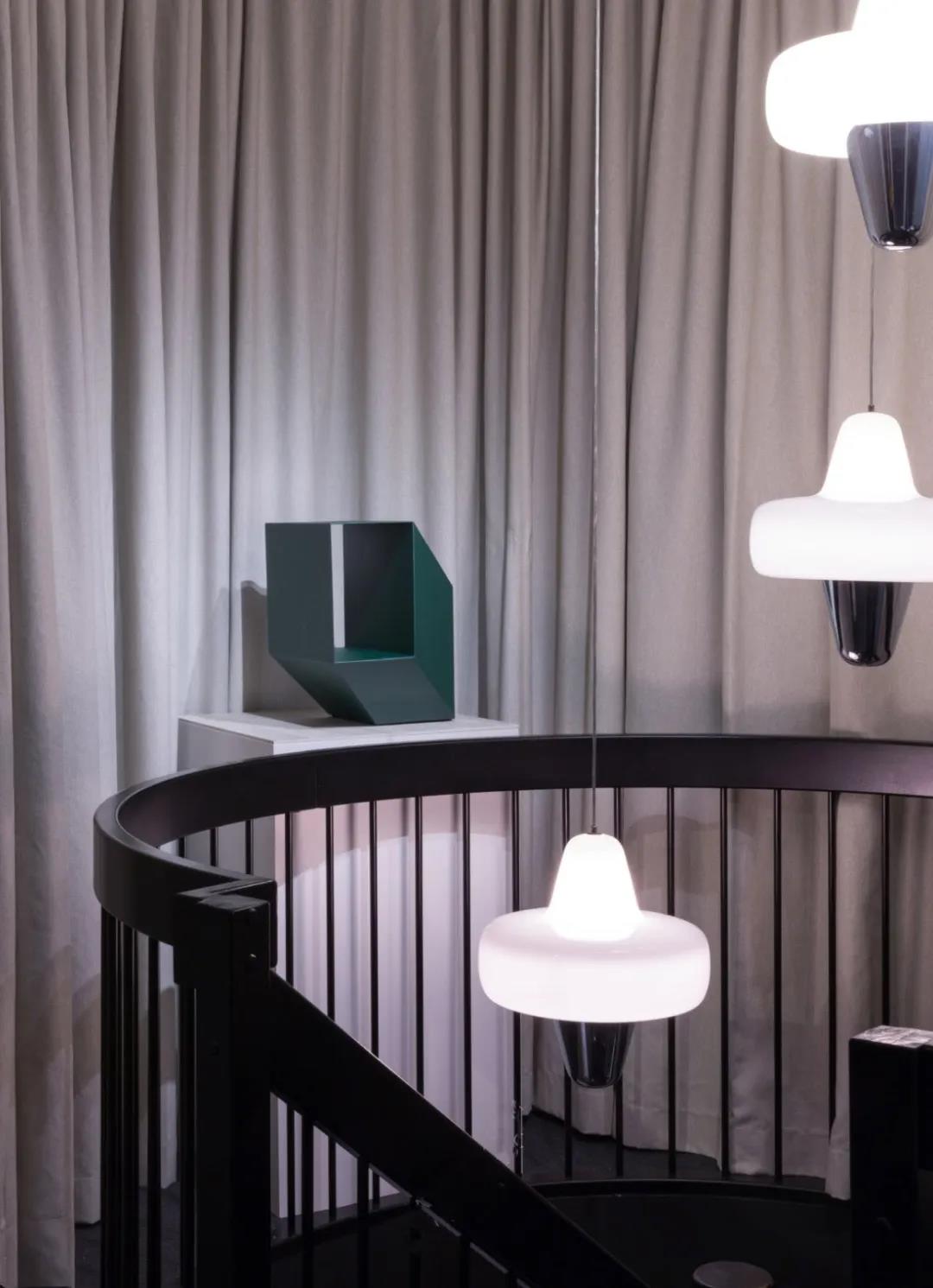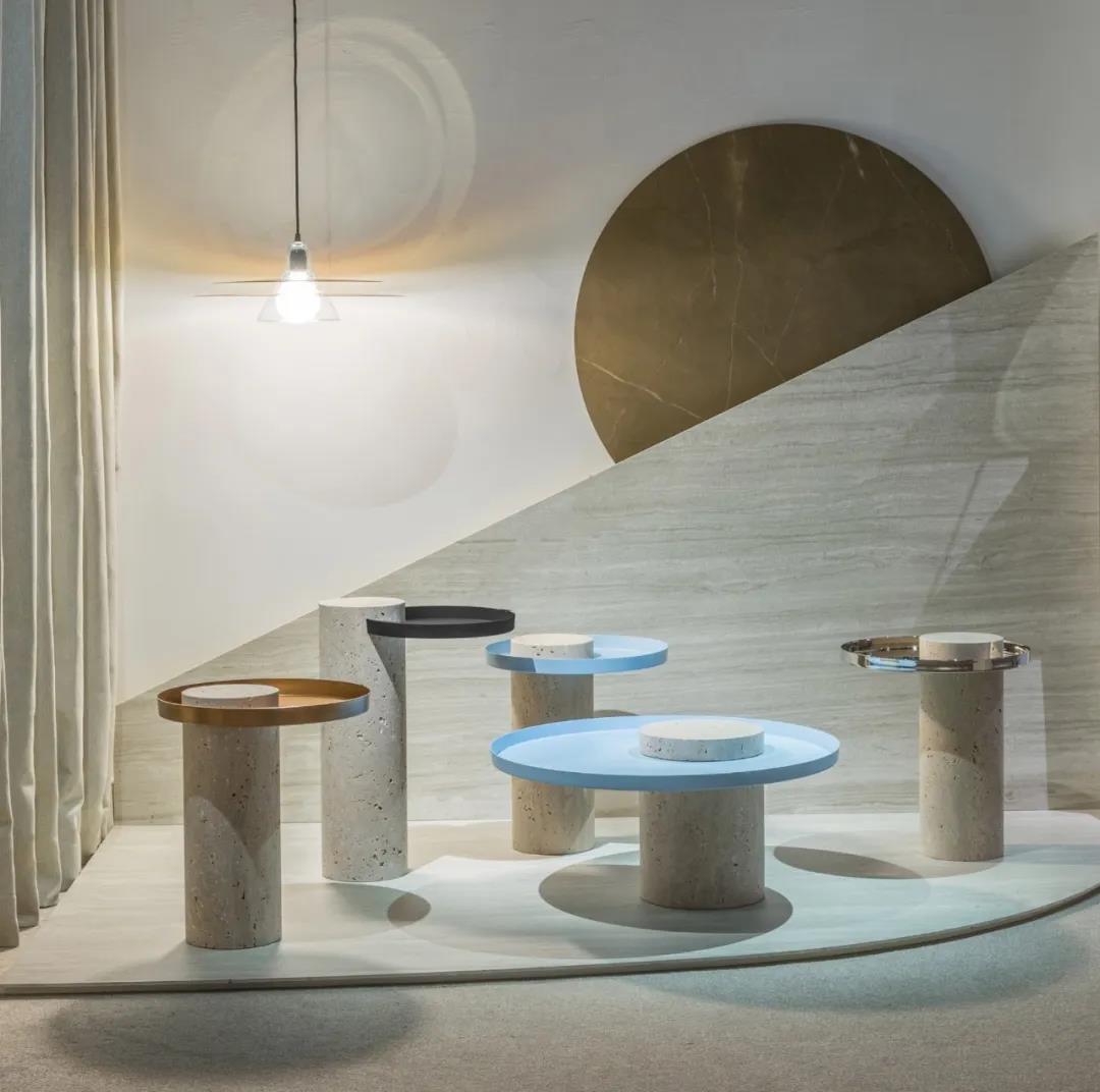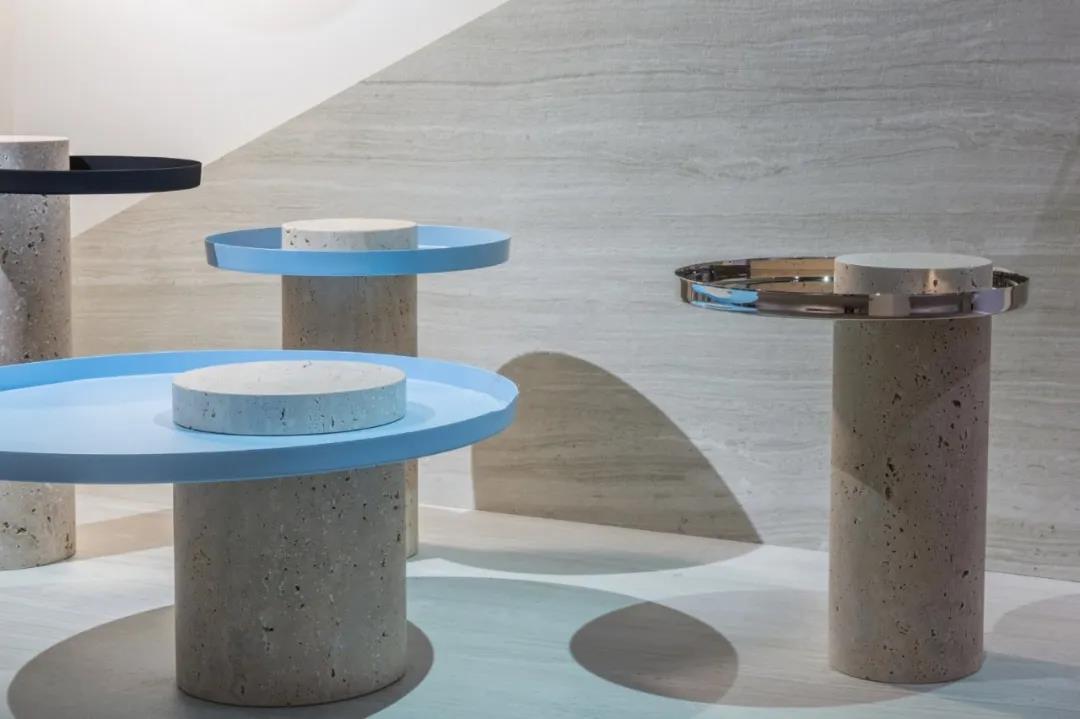 展覽還包括Sebastian Herkner設(shè)計(jì)的禮炮咖啡桌,這是首次在石灰華中使用。這些桌子于2013年首次推出,結(jié)合了圓柱支撐和懸臂圓形表面。