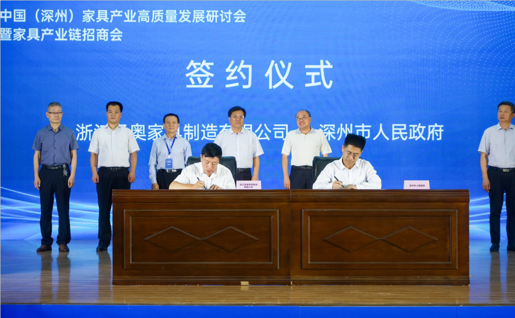 9月11日,在中國(深州)家具產業高質量發展研討會及家具產業鏈招商會上,浙江省家具行業協會理事長、圣奧集團董事長倪良正宣布了一則重大消息:圣奧北方總部項目落戶深州家具產業園,該項目將建成行業標桿、北方樣板,助力圣奧實現新的五年規劃。現場,深州市人民政府與圣奧正式簽約。
