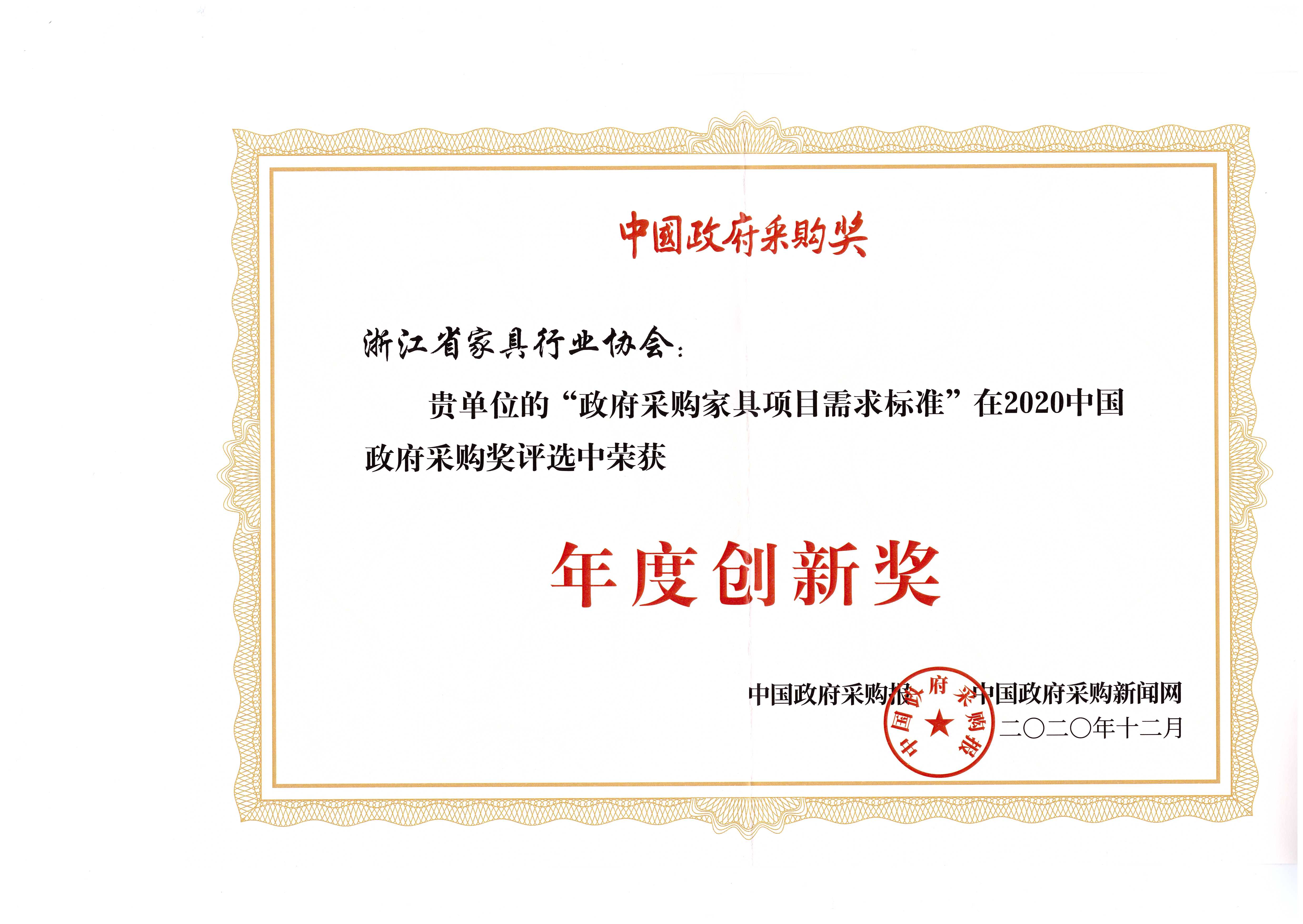 2020中國政府采購獎于9月7日拉開序幕,經過組委會的資格預審,專家評審委員會根據評選指標體系嚴謹、公正、深入的評估,社會公示等階段,獲獎名單于12月14日公示。由浙江省政府采購聯合會、浙江省家具行業協會聯合報送的《政府采購家具項目需求標準》獲得“2020中國政府采購獎 年度創新獎”。