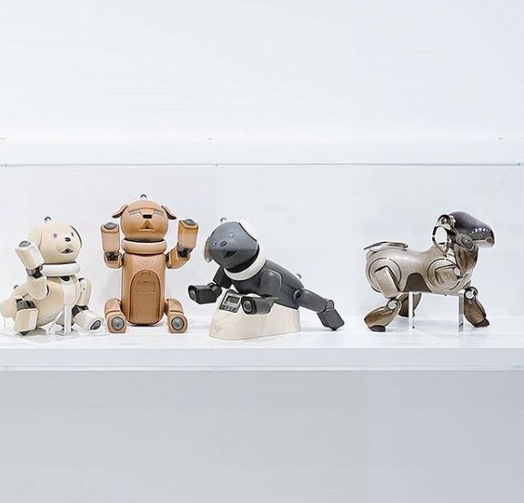 走進 Sony Park 的負一層,可以看到接待的前臺和一些藝術海報,休閑區還有兩只 AIBO 機器狗和到訪的游客互動。