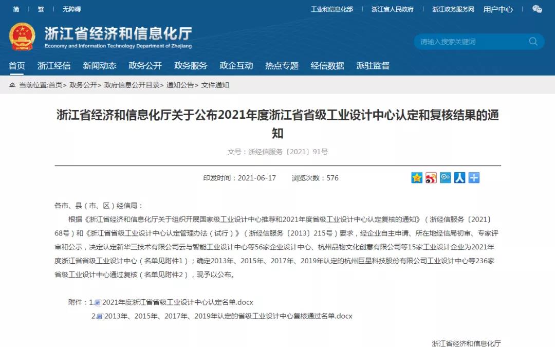 2021年6月17日,浙江省經(jīng)濟(jì)和信息化廳官網(wǎng)公布了《2021年度浙江省省級(jí)工業(yè)設(shè)計(jì)中心認(rèn)定和復(fù)核結(jié)果的通知》,經(jīng)企業(yè)申請(qǐng)、所在地經(jīng)信局初審、專家評(píng)審和公示等流程,省經(jīng)信廳決定56家企業(yè)設(shè)計(jì)中心、15家工業(yè)設(shè)計(jì)企業(yè)為2021年度浙江省省級(jí)工業(yè)設(shè)計(jì)中心;確定236家省級(jí)工業(yè)設(shè)計(jì)中心通過(guò)復(fù)核。