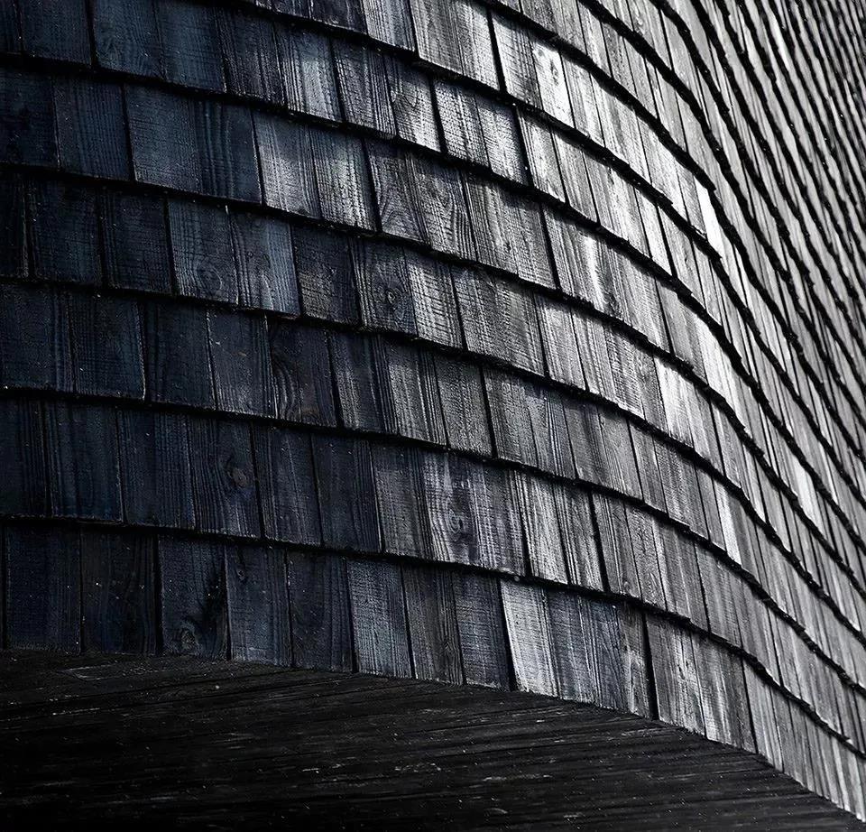 建筑外立面是燒杉板應用的普遍方式,現代工藝下的燒杉板色彩純粹、質地均勻、經歷過烈火的洗禮之后木材表面的紋理更具有立體感。