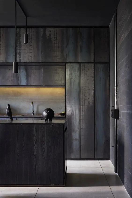表層炭化的燒杉板質地細膩,深層炭化的燒杉板因皴裂而粗獷再于金屬稍加搭配時尚又不失野性,現代又不失傳統。