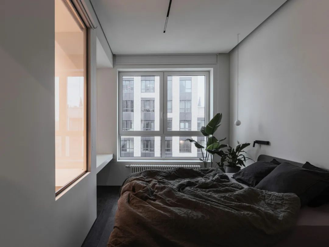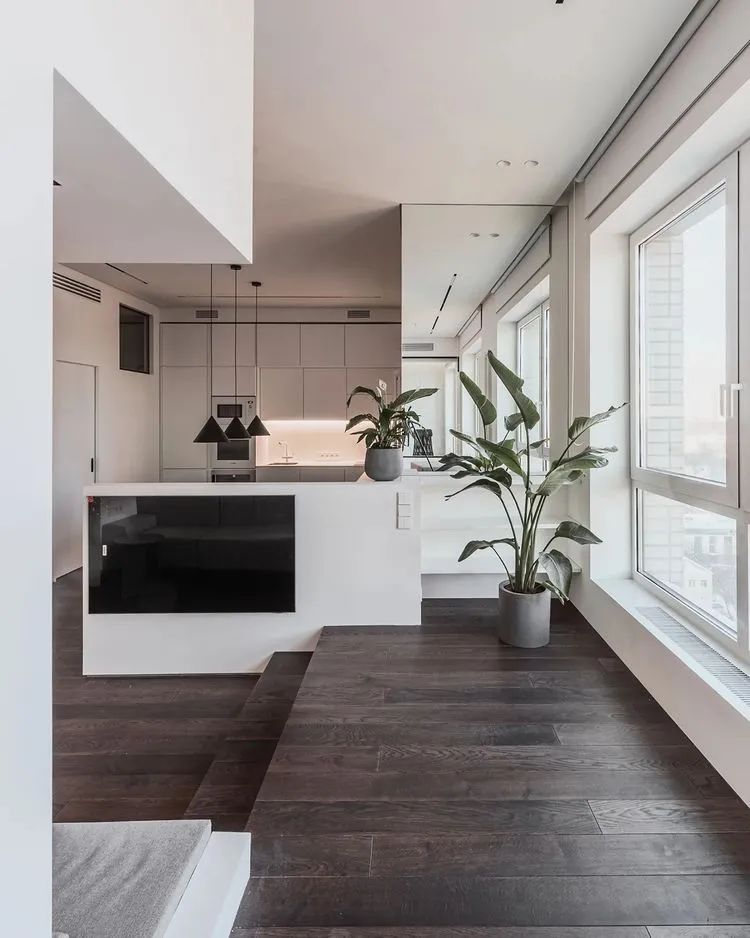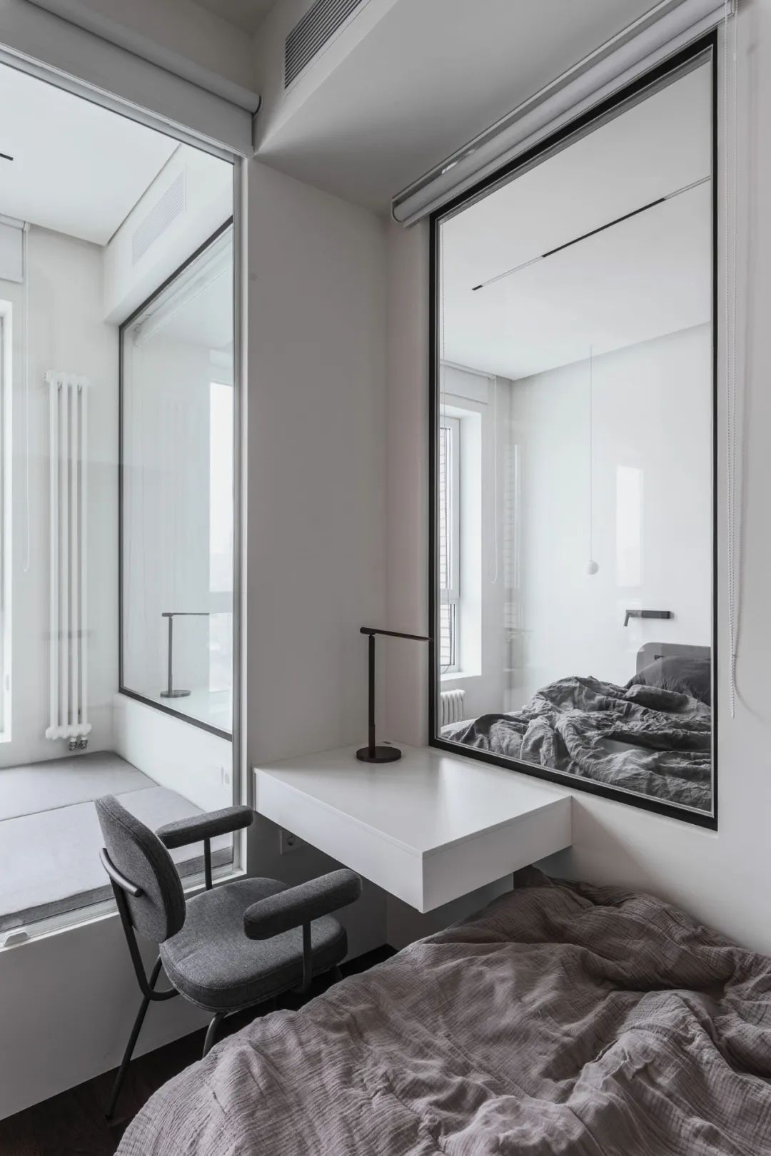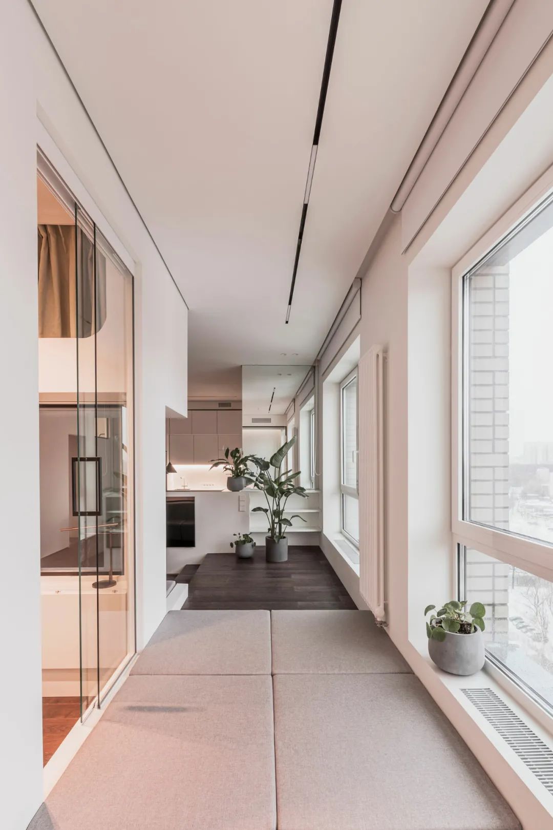 公寓的最大優點是其中一堵外墻上有4扇大窗戶,對我們來說,保持這些窗戶沿線的空間完整是非常重要的,而不是用空白的墻壁分隔它。因此,沿著窗戶出現了一個單獨的休閑區,所有的房間也都是面向的。