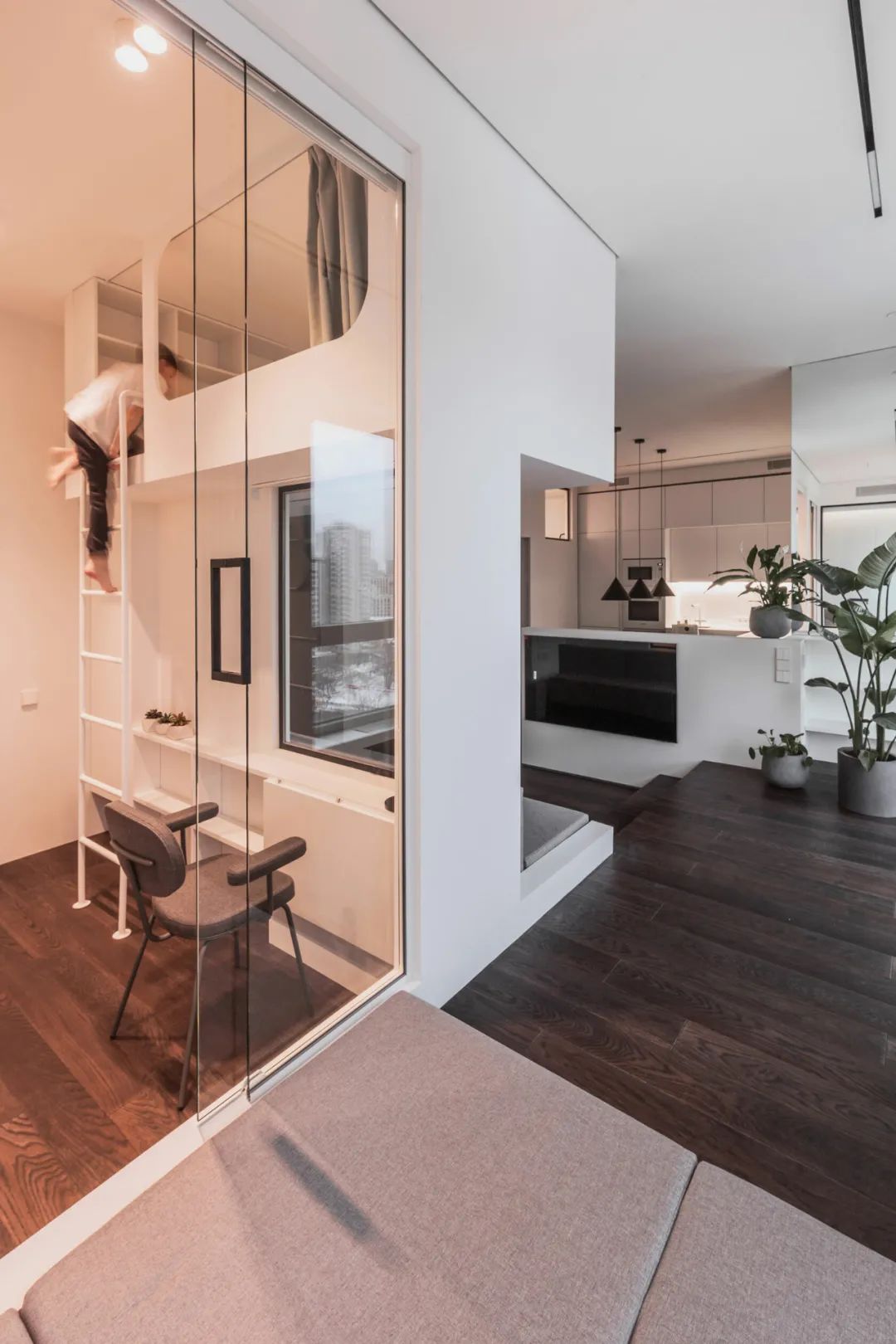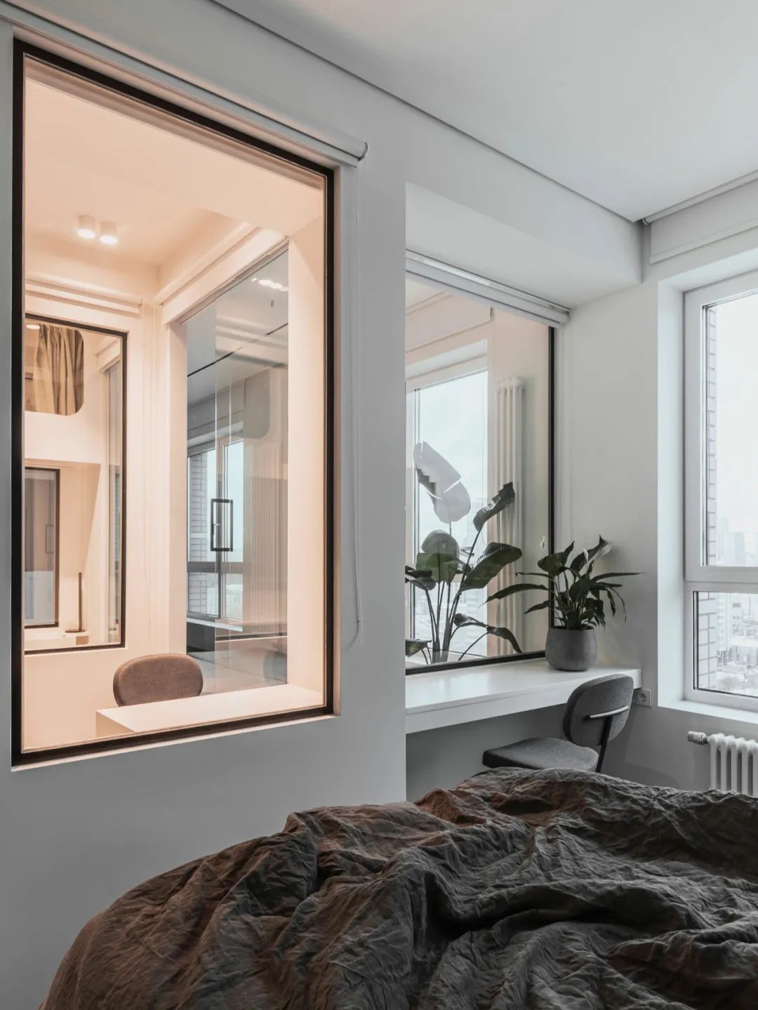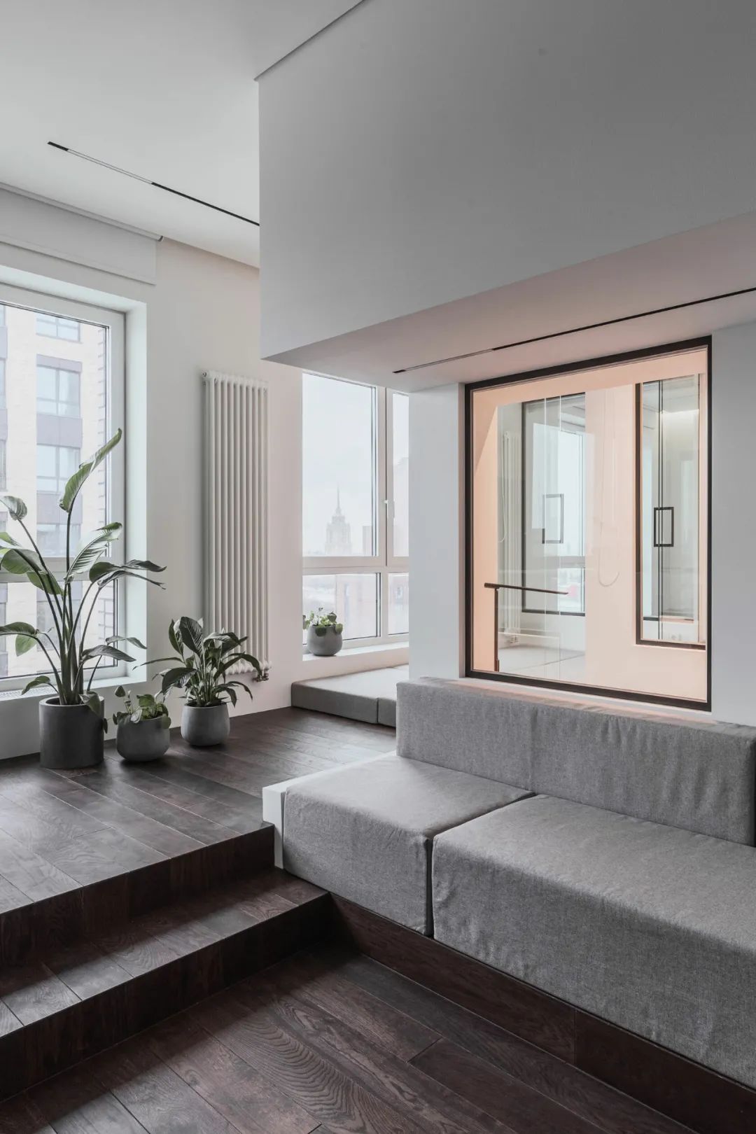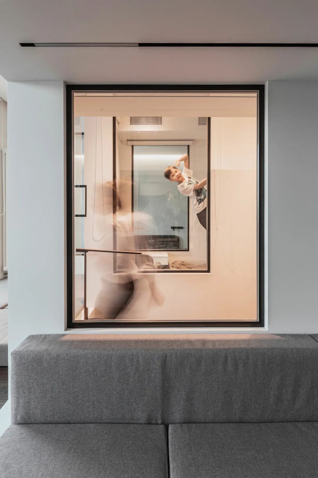 中央體量劃分了公寓的整個空間,包括兩個兒童房、一個客廳和一個休閑區。在內部隔斷上設置了窗戶,因此公寓在所有房間中都是可見的。所有室內窗戶都配備了卷簾,這樣你就可以完全將你的區域與其他人隔離開來。為了增強這些窗戶的隔音效果,在具有U形截面的復合鋁型材中使用了Triplex6+4。