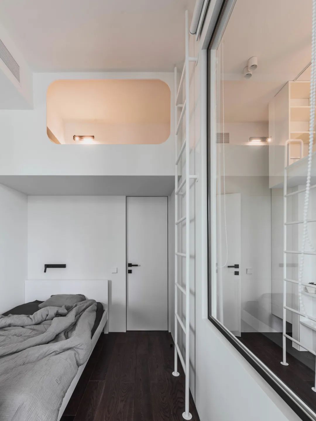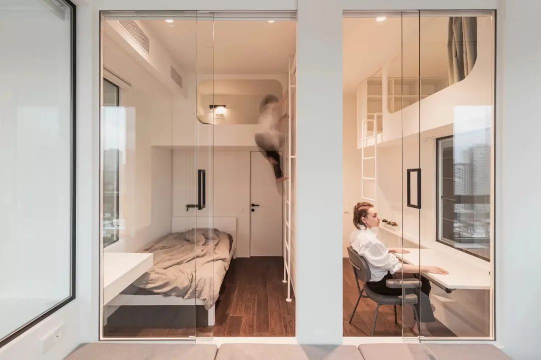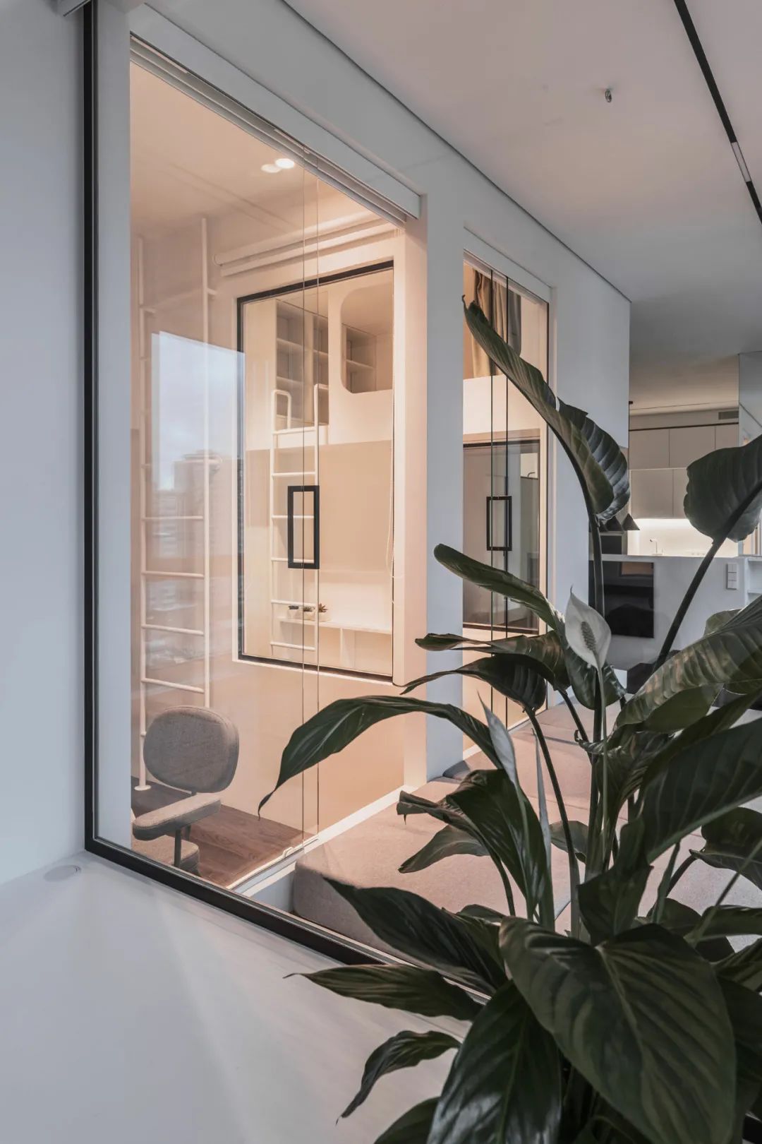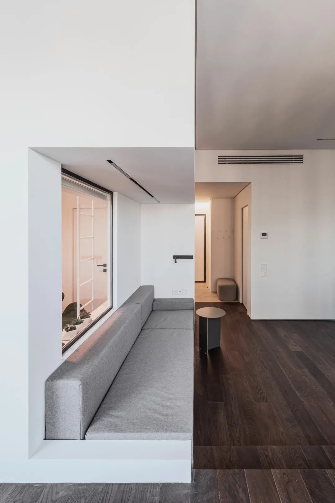 中央體量劃分了公寓的整個空間,包括兩個兒童房、一個客廳和一個休閑區。在內部隔斷上設置了窗戶,因此公寓在所有房間中都是可見的。所有室內窗戶都配備了卷簾,這樣你就可以完全將你的區域與其他人隔離開來。為了增強這些窗戶的隔音效果,在具有U形截面的復合鋁型材中使用了Triplex6+4。