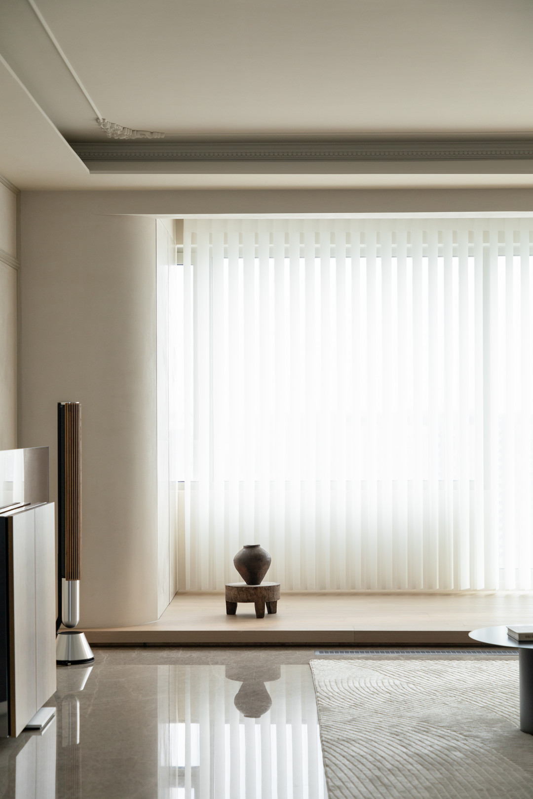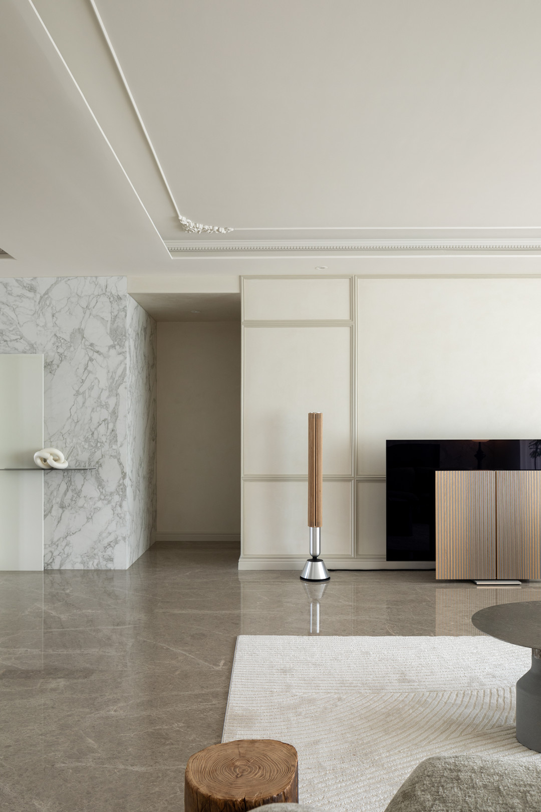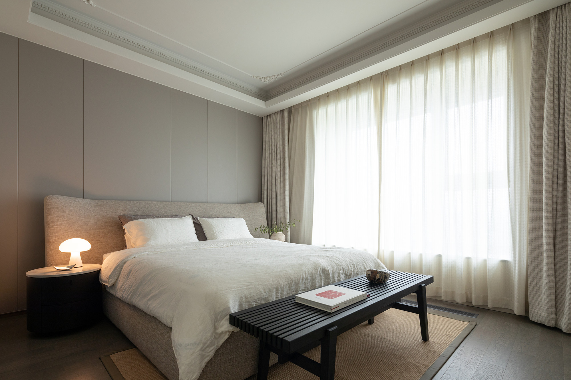 低飽和度的空間背景讓自然光多次漫反射后愈發柔和,無主燈結構的間接光環境構筑溫馨質感。