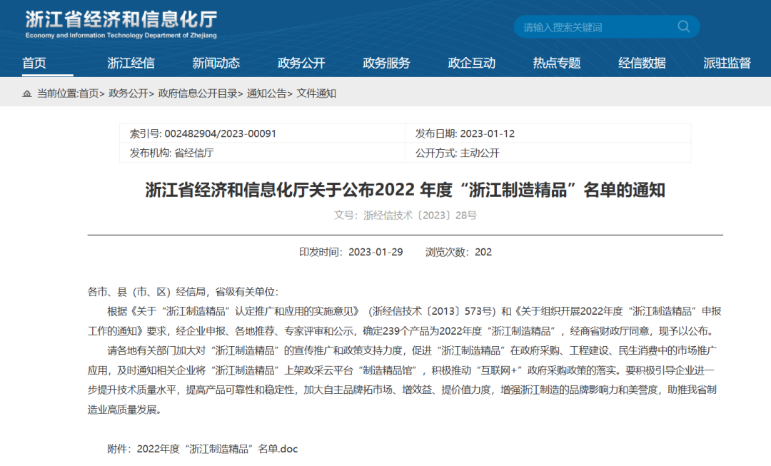 該榜單根據《關于“浙江制造精品”認定推廣和應用的實施意見》(浙經信技術〔2013〕573號)和《關于組織開展2022年度“浙江制造精品”申報工作的通知》要求,經企業申報、各地推薦、專家評審和公示后評出。